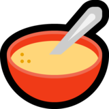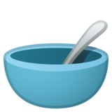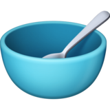 | 含义/描述 | 内有银匙的碗,用于吃谷类食品或汤。碗的颜色在不同的平台上不同,数平台碗里有粥、汤或麦片。它一般表示麦片或粥,或者流质食物和半流质食物,比如:米汤、麦片、粥、稀饭、混沌、汤类,也可以代表早餐。 |